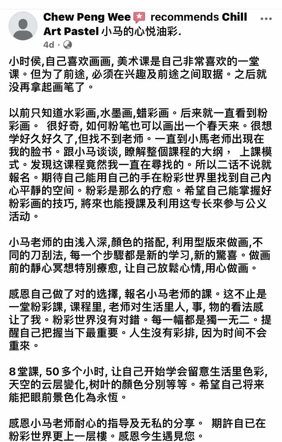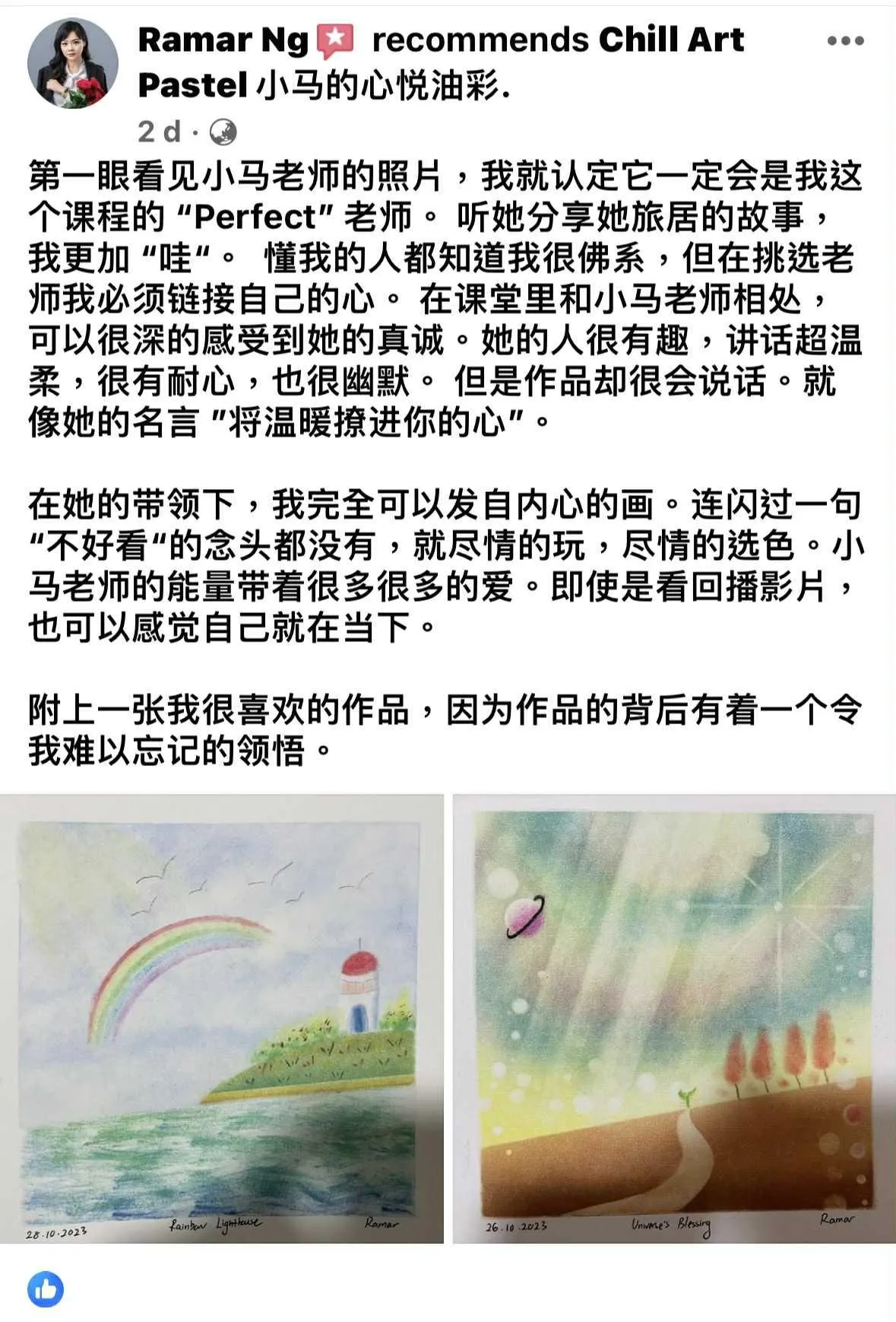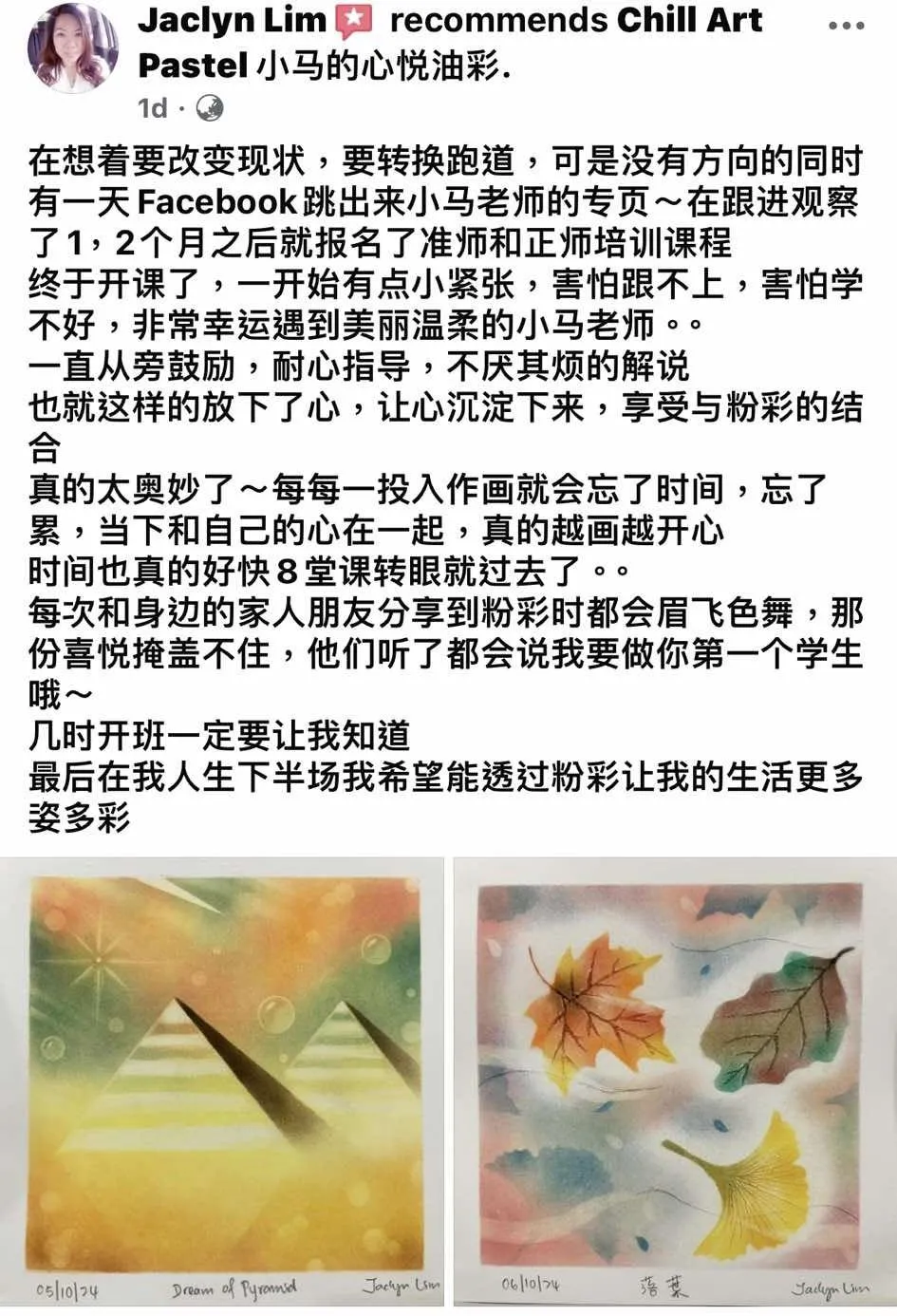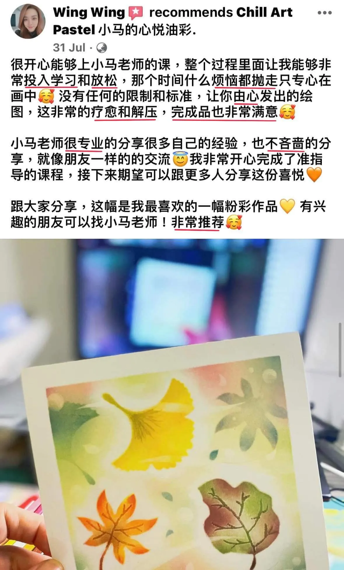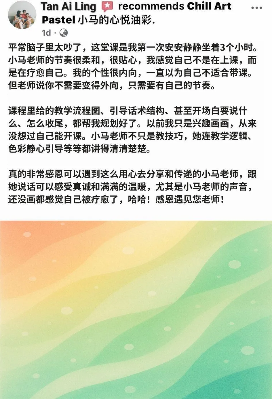 课程特别适合对粉彩/艺术疗愈感兴趣,但没有基础 希望透过色彩靠近自己、释放情绪、减压。 想透过粉彩结合自己的疗愈事业、发展副业、建立自由生活的人。